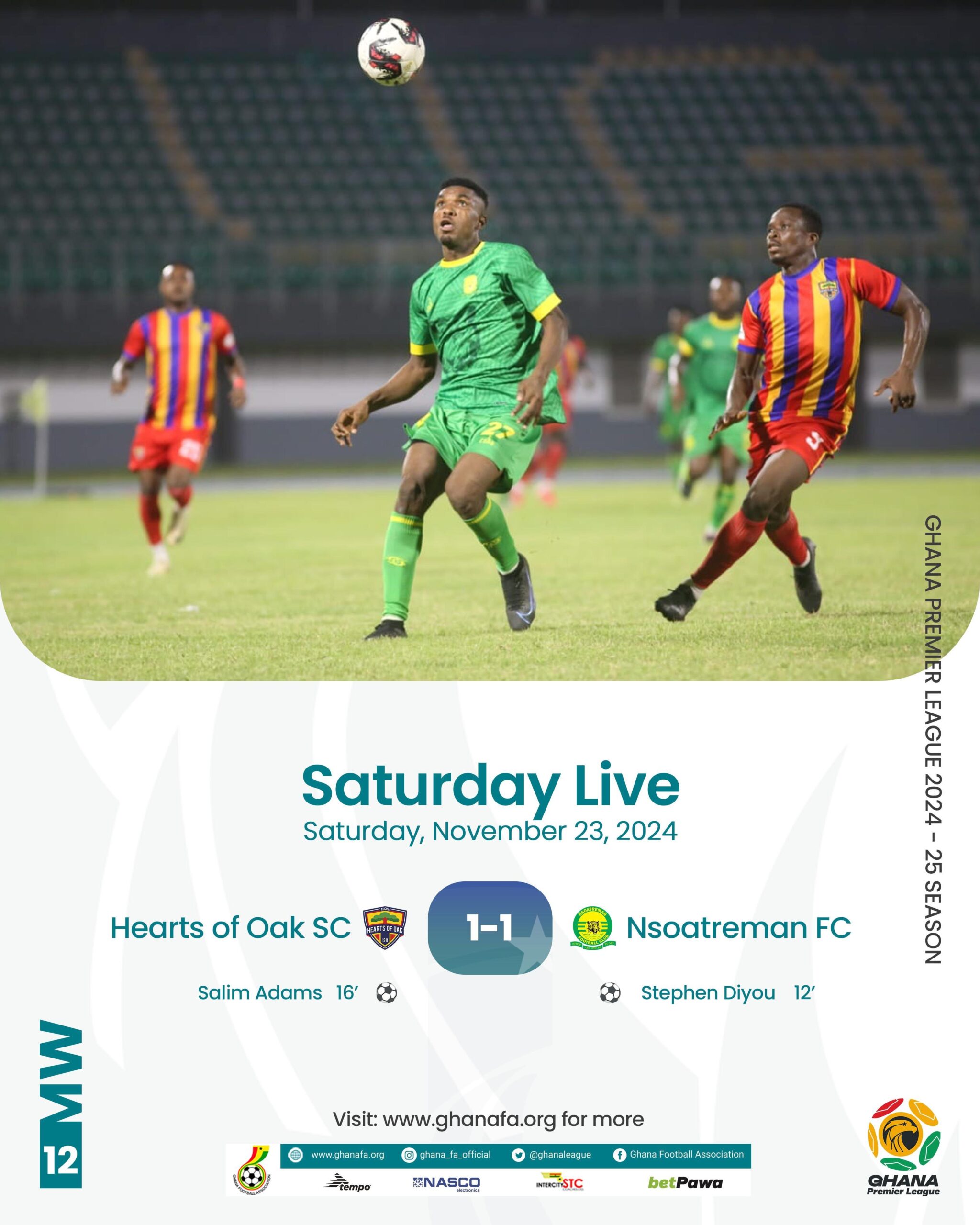 Salim Adams earned a point for Hearts of Oak as they were held to a 1-1 draw at the University of Ghana Sports Stadium by the defending MTN FA Cup winners, Nsoatreman FC.