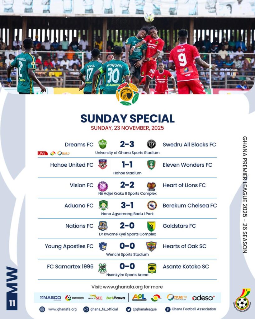 Aduana Stars have moved to the top of the 2025-26 Ghana Premier League (GPL) standings at the end of matchweek 11.