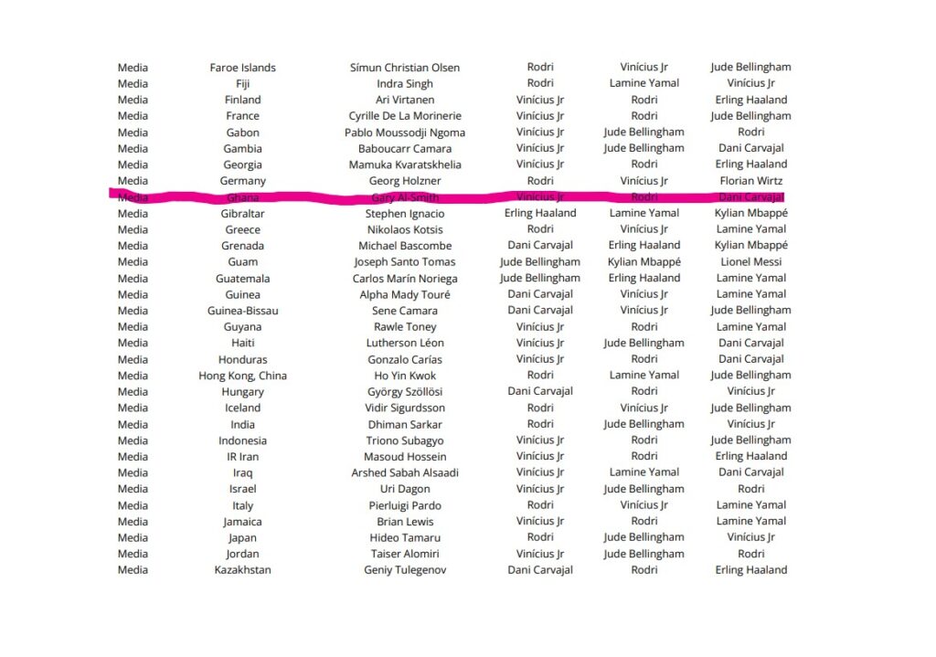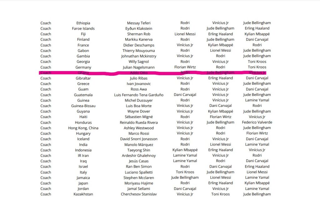 Though none of the captains of the Black Stars voted, Otto Addo voted for Rodri, with his second and third votes going to Jude Bellingham and Vinicius Jr respectively.