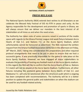 In a press release, the NSA revealed that it received an official request from the Ghana Football Association (GFA) on Friday, March 28, 2025, to host the match at the Accra Sports Stadium. However, after evaluating the necessary preparations and safety protocols required for a successful game, it became clear that hosting the fixture was not feasible at this time.