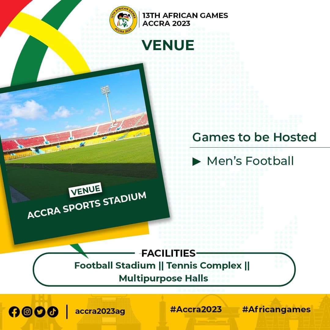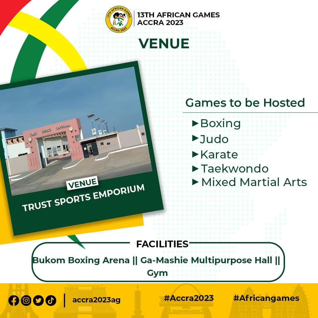 Accra Sports Stadium will also host football, while the Bukom Boxing Arena will host boxing, judo, karate, taekwando, and mixed martial arts.