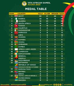 Meanwhile, Ghana is struggling to break into the top five on the medal table, led by Egypt, Nigeria, Algeria, South Africa, and Tunisia.