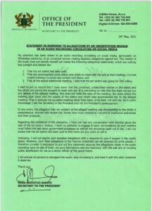 “She does not state the date of the meeting, the place where the meeting took place, and the names of the elders and chiefs who accompanied her to the alleged meeting. That is because the so-called meeting never took place, or at least, not with me. As is public knowledge, I am the Secretary to the President and not the President’s spokesperson.”