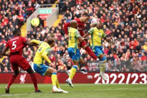 Andre Ayew challenges Darwin Nunez in the air for the ball.