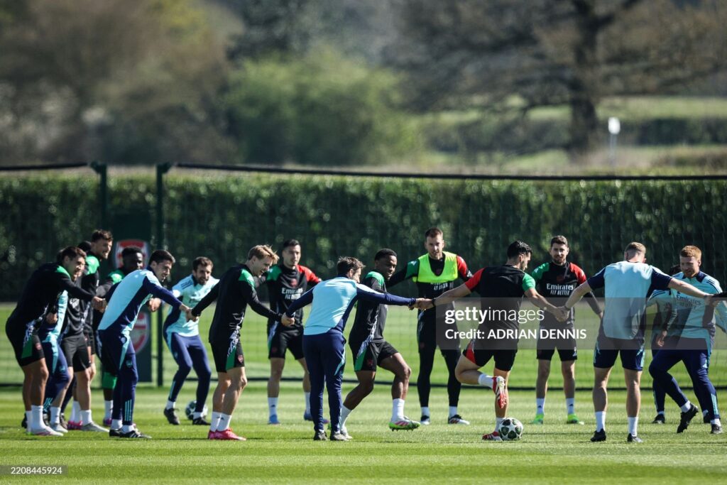 Arsenal’s team players take part in a training session at the Arsenal Training centre in Shenley on April 7, 2025, on the eve of their UEFA Champions League Quarter final first leg football match against Real Madrid.