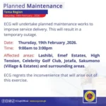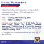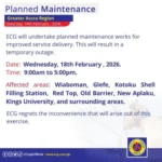 The Electricity Company of Ghana (ECG) has announced a series of planned maintenance exercises across several regions, beginning Monday, February 16, 2026.