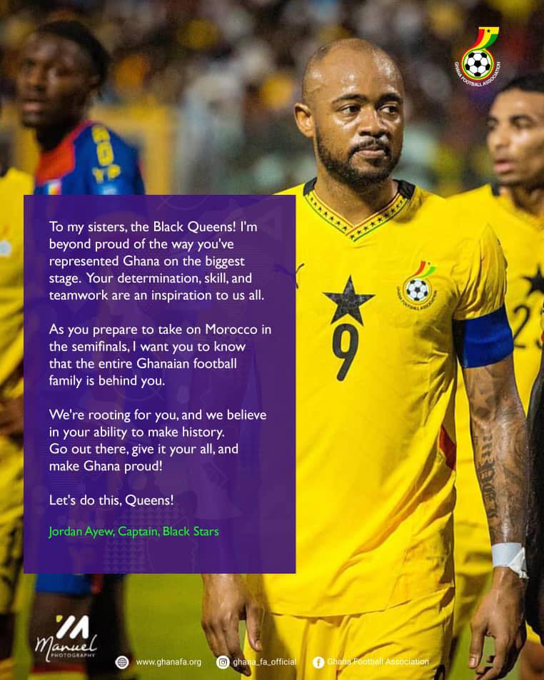 Jordan Ayew, captain of the Black Stars of Ghana, has sent a heartwarming message of support to the Black Queens of Ghana.