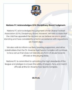 In a statement, Nations FC reassured supporters, traveling fans, and stakeholders that the Dr. Kwame Kyei Sports Complex is committed to a zero-tolerance policy on any form of abuse directed at officials or players.