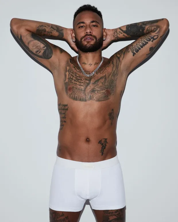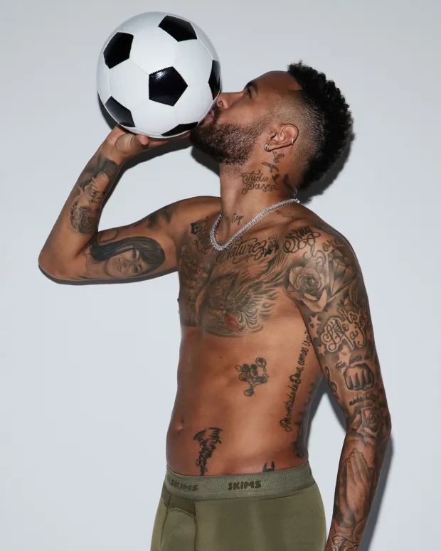 In an advertisement for Kim Kardashian’s SKIMS clothing line, Neymar displayed his tattoos while wearing only his SKIM’s boxers.