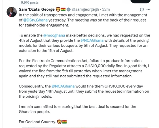 The Minister for Communications, Digital Technology and Innovation, Samuel Nartey George, has announced that MultiChoice Ghana will face a daily fine of GH₵10,000 from August 14.