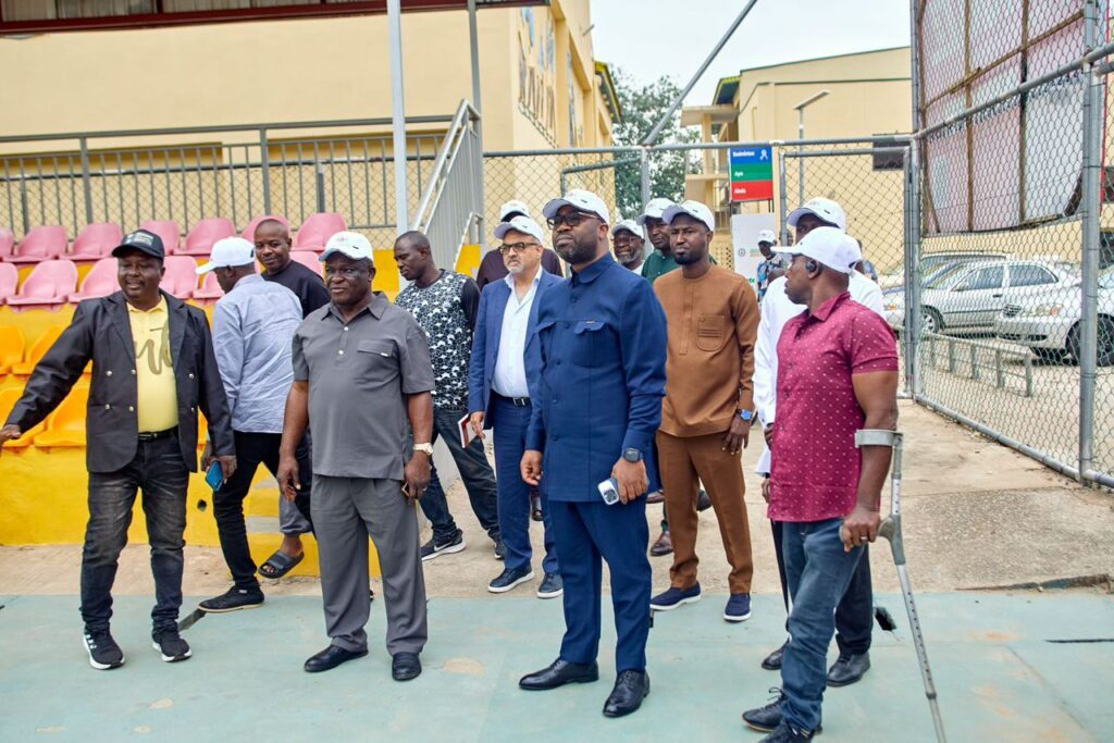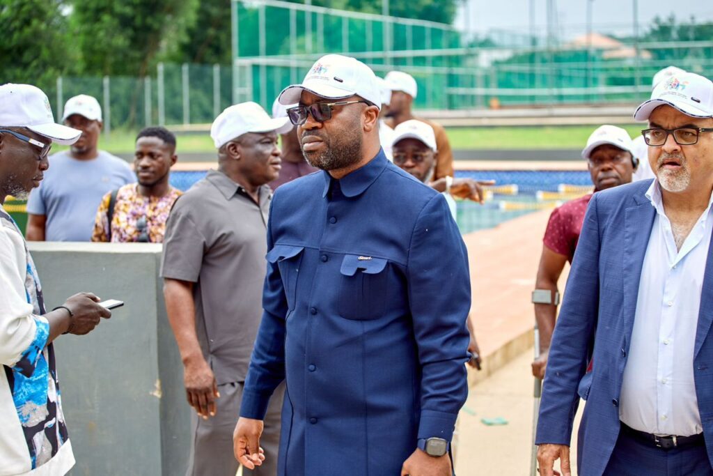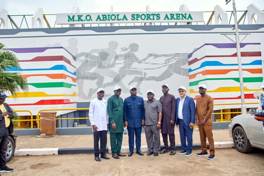 President Deen, in the company of the president and secretary-general of the NPC, along with Mr. Ignatius Elletey, Mr. Foster Kwarteng, and Sib Ali, all of the AfPC, as he toured the multi-purpose M.K.O. Abiola Sports Arena—host facility for the games.